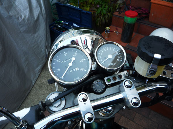 今は一文字ハンドルをつけているのだが、メーターの配置がセパハンをつけていた時のまま。ハンドル位置が上がったことで、メーターが埋もれて車体前から見るとメーターの存在感が皆無。バランス悪ぅ。