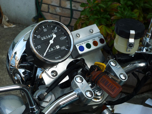 アメリカンのパーツは存在感が違いますね。運転しているとメーターよりインジケーターのほうに目がいきますよ。また、取り付け角度が絶妙で、夜にニュートラルランプが光ると目潰しを食らいます。