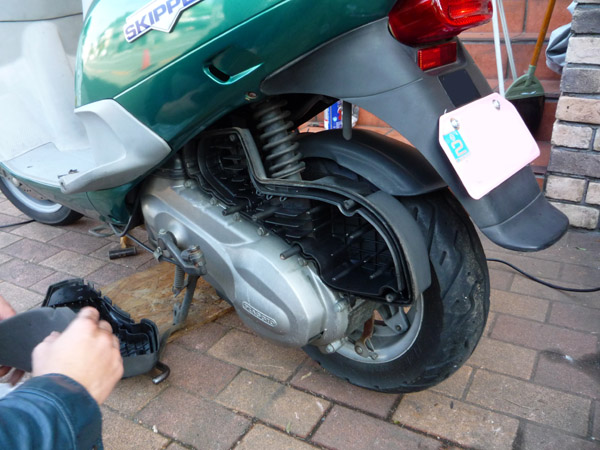 このクソ暑い日差しの中、スキッパーのブレーキ整備でございます。