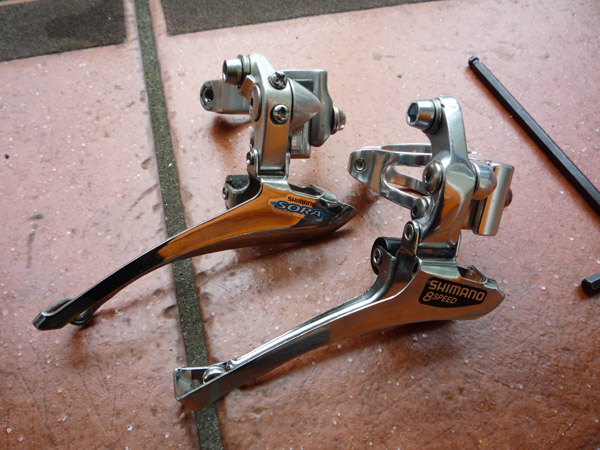 FDを車体に取り付けるには、直付け式とバンド式があって、さらにバンド式には、バンド径が31.8mmとか34.9mmとかあって非常にややこしい。我が家の自転車はバンド式の34.9mmで、ヤフオクで落としたFDはバンド式の31.8mm。バンドを新しいFDに移植して取り付ける。パーツリストがると分かりやすいんだけどネ。