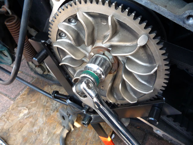 プーリーのスターターギアに専用工具を噛ませて、おりゃさっと回しますです。