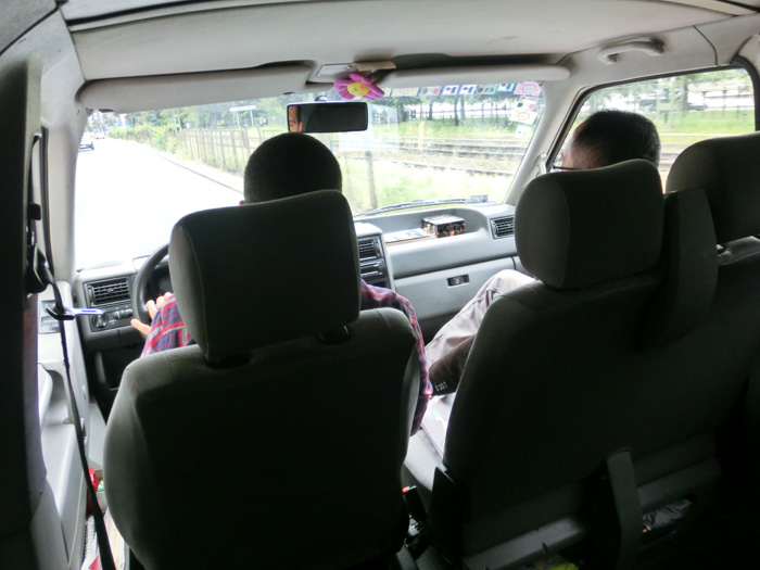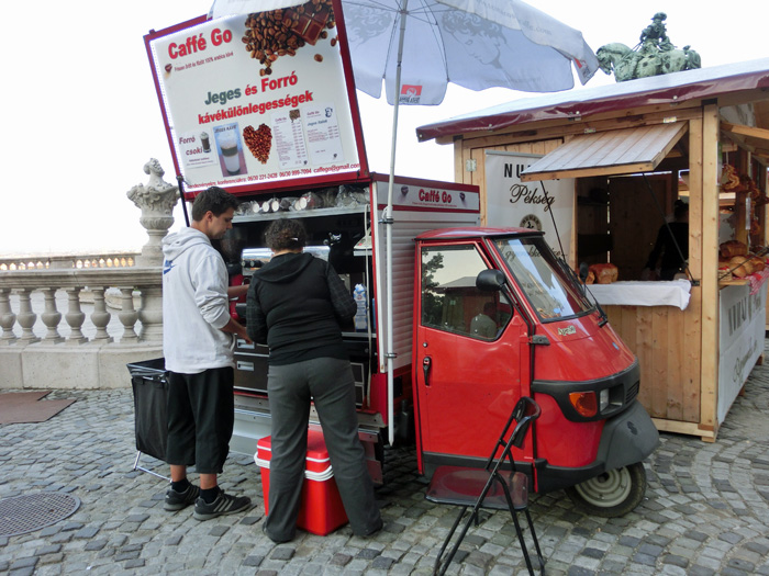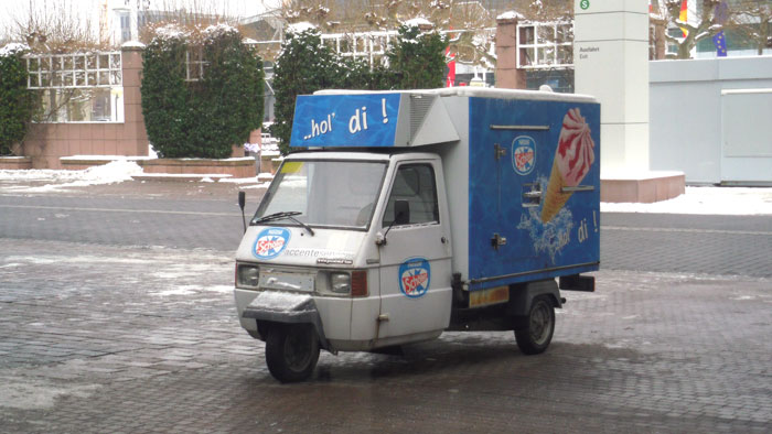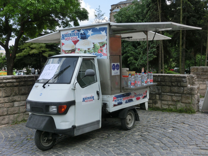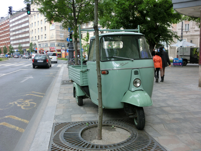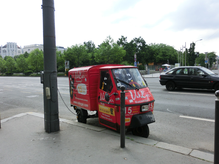 日本の軽トラよりも小さいので歩道のポールの間を通って歩道に進入。