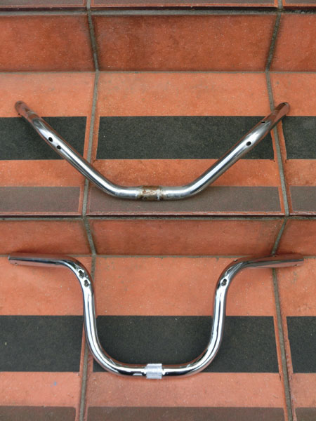 ハンドルをはずして比べる。上が旧の自転車用ハンドル。