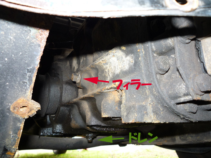 ミッションケース側面にフィラープラグ、下にドレンプラグが見えます(ミッションケースが錆びてるとか、文字がなぜポップ体なのかとか、そういうのはキニシナイ)。