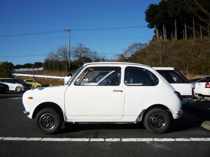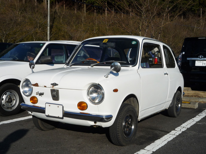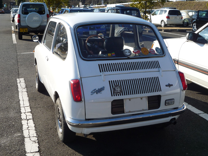 反省して車にもどると、キャトルの後ろに白い車が。あ、R-2。ひろしまさん発見。