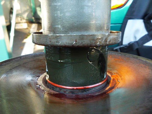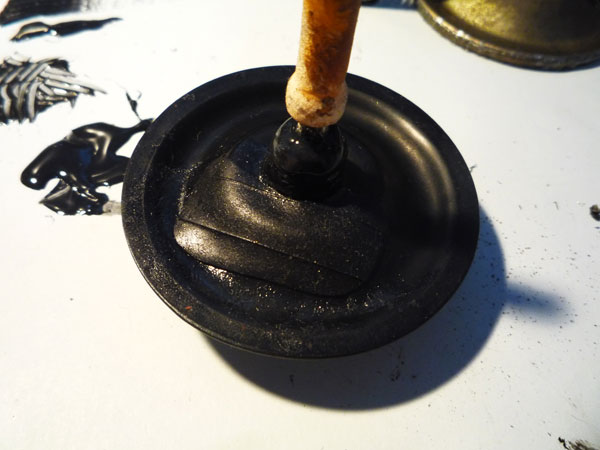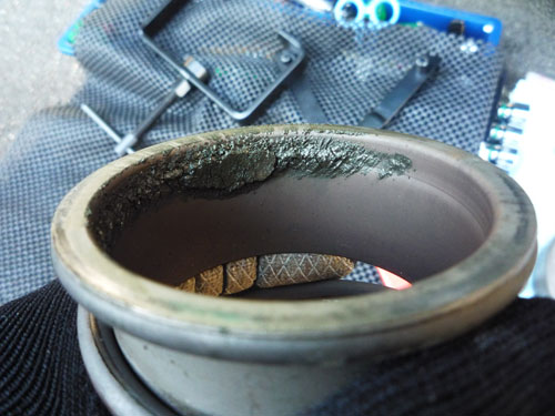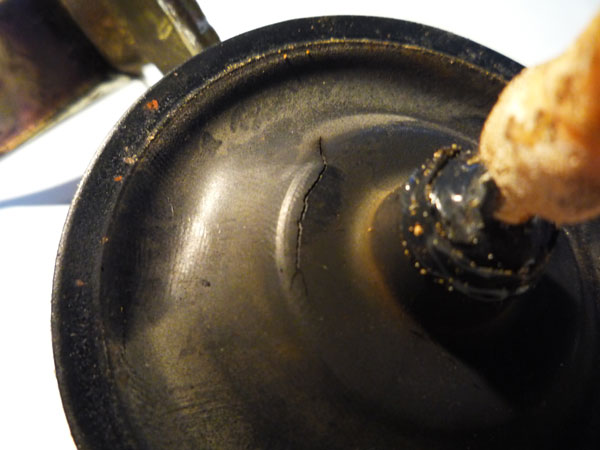 カシメて修理完了。カシメ部分の外側にも念のためガスケットを塗っておきますよ。特に漏れはなかったんだけど念のため保険として。