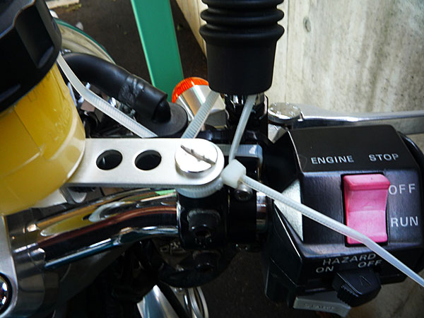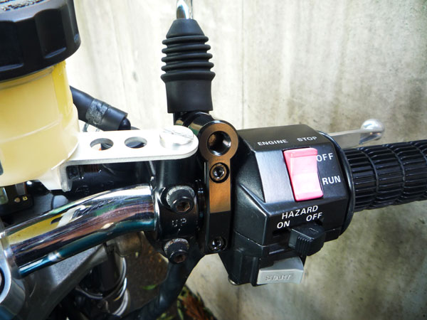 ブレーキ関係とスイッチボックスの間に無理やり場所をつくってミラーステーを取り付け。