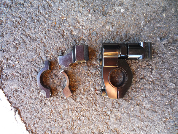 というか、そもそもマスターシリンダーについてるミラー用の穴を使えばいいのだが、ハンドルを一文字にしている関係でどうも体とミラーが近すぎて良い位置にミラーがこないのですわ。
