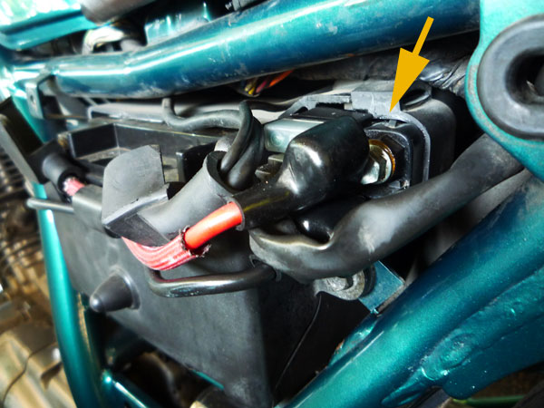 左のサイドカバーを外すと、バッテリーの横にくっついてるリレーでござんすね。